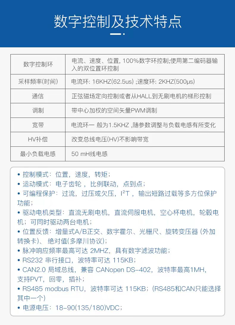 •CAN2.0 局域总线,兼容 CANopen DS-402,波特率最高 1MHz ;